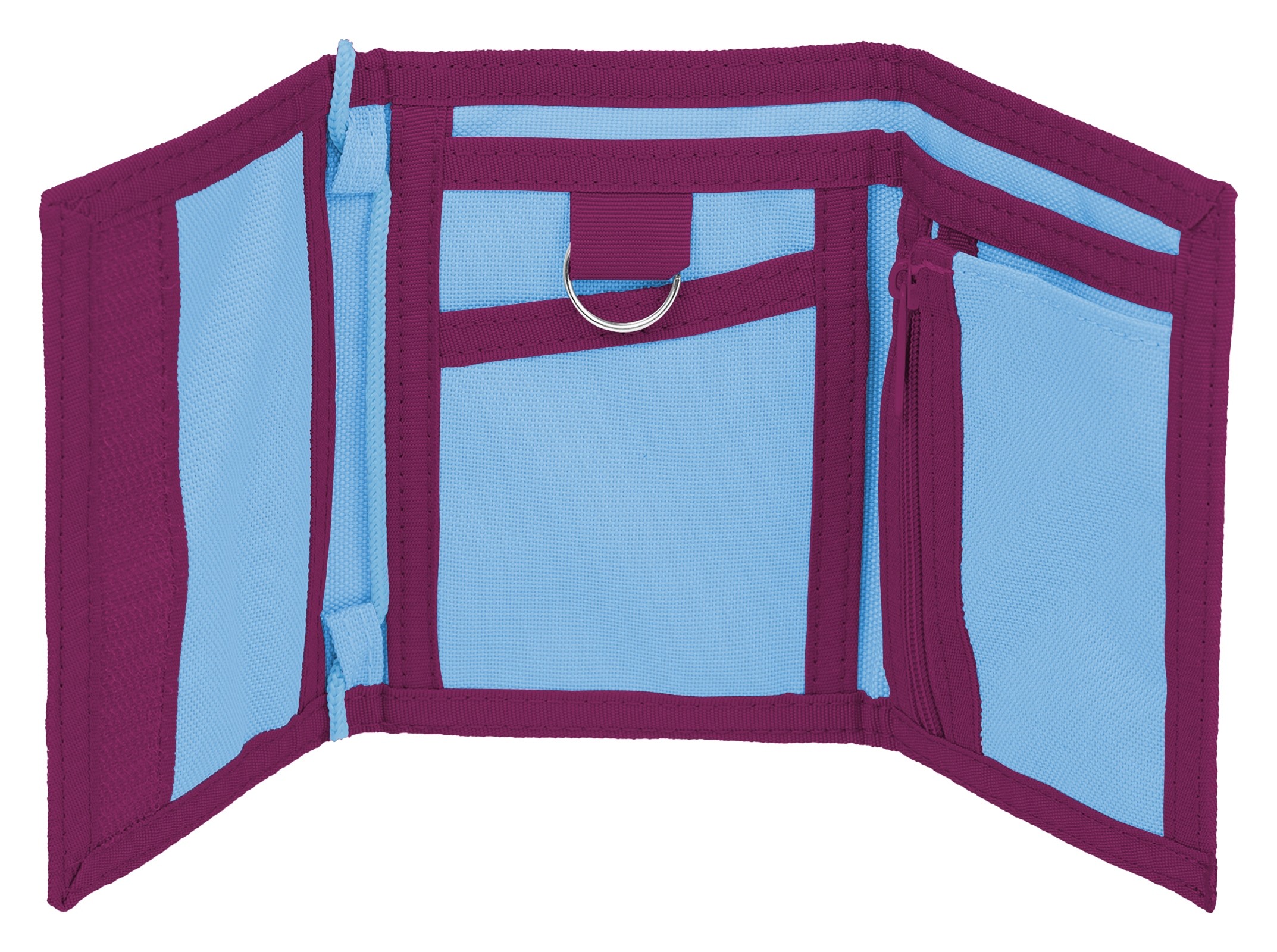 Uvnitř naleznete chytrý organizér s pěti kapsami na bankovky a další drobnosti, kapsu na zip na mince a kovový kroužek na klíče.