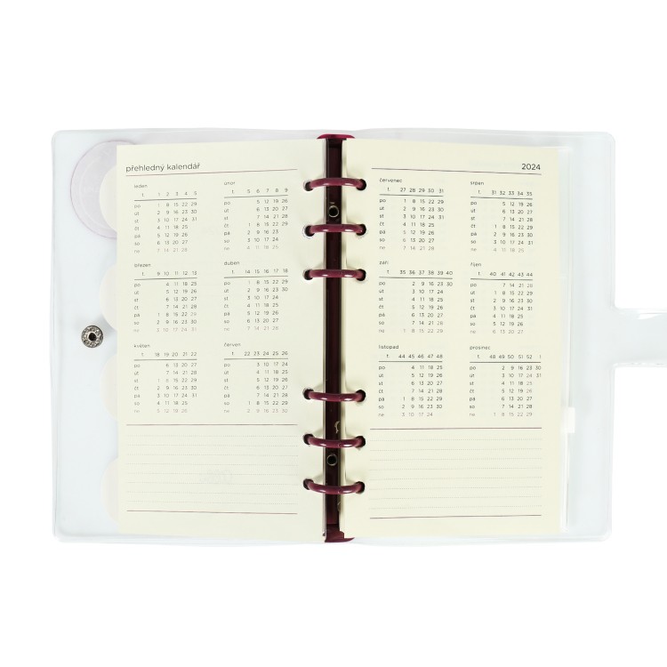 Plánovací diář je rozdělený na čtyři části - diář 2024, plánovač událostí, linkované a čisté listy např. na k