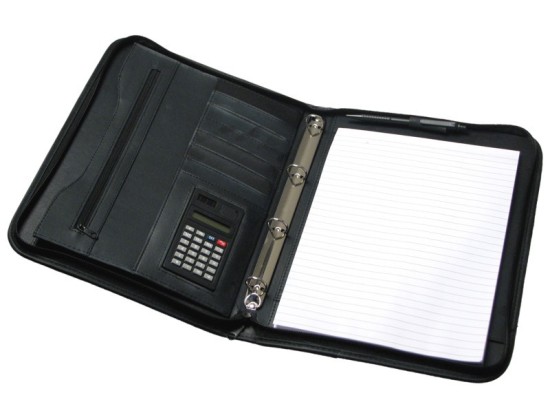Uvnitř najdete poznámkový blok, poutko na tužku, přihrádky na vizitky a dokumenty, kapsu na mobilní telefon a kalkulačku.