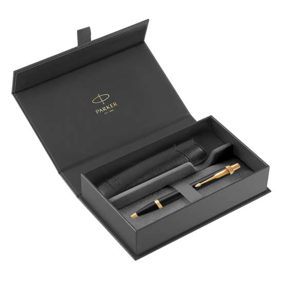 Sada obsahuje černé PU pouzdro a kuličkové pero Parker IM Black s mosazným tělem s lesklou černě lakovanou povrchovou úpravou. V kombinaci s doplňky pokovenými zlatem, s leštěnou úpravou.
