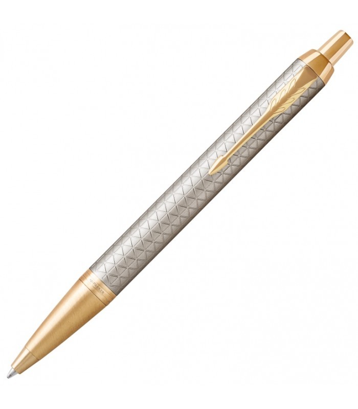 Sada obsahuje černé PU pouzdro a kuličkové pero Parker IM Premium Warm Grey s tělem z eloxovaného hliníku se zdobnou rytinou vyvedenou pomocí laseru, povrch ošetřen pískováním. V kombinaci s doplňky pokovenými zlatem, s leštěnou úpravou.