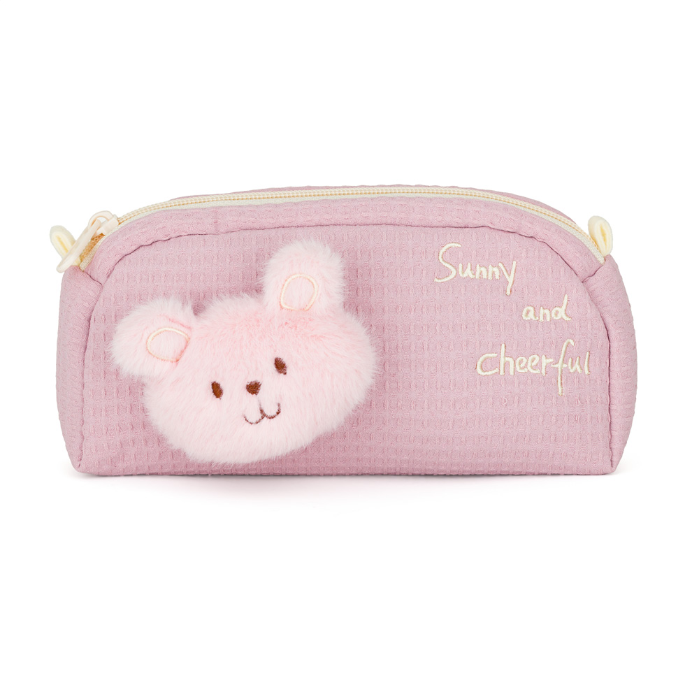 Hlavní ozdobou je měkká plyšová hlavička medvídka, která působí jako malý mazlíček. Zbytek pouzdra je z příjemné textilní vafloviny a uvnitř je podšívka z odolného polyesteru, která chrání vše, co do něj děti uloží.