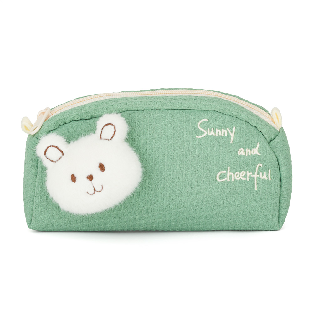 Hlavní ozdobou je měkká plyšová hlavička medvídka, která působí jako malý mazlíček. Zbytek pouzdra je z příjemné textilní vafloviny a uvnitř je podšívka z odolného polyesteru, která chrání vše, co do něj děti uloží.