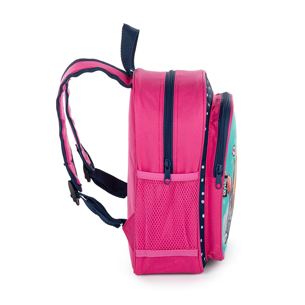 Má jednu velkou kapsu, menší kapsu na svačinu a postranní kapsičky na lahev na pití.