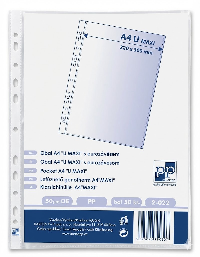 • Formát: A4 MAXI (šířka 220 mm, výška 300 mm)• Typ obalu: "U" (otevřený nahoře)
