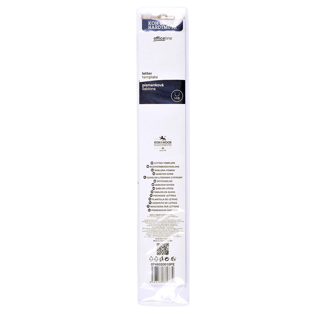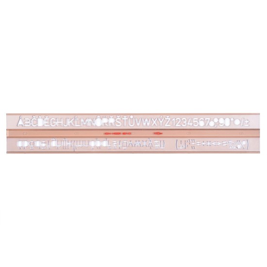 Písmenková šablona vyrobená z kouřového průhledného polystyrenu. Je určena pro práci s technickým perem 1,0 mm.Obsahuje znaky velké a malé abecedy, číslic a matematických znaků. Veškeré znaky jsou velikosti 10 mm a tvaru ISO. Šablona je určena k popisování ve škole i v kanceláři.