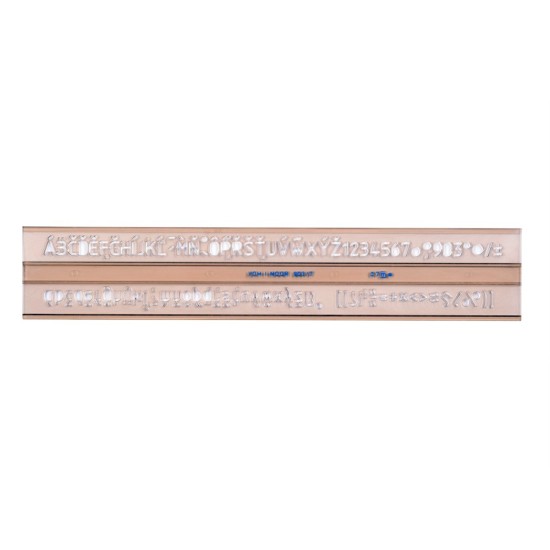 Písmenková šablona vyrobená z kouřového průhledného polystyrenu. Je určena pro práci s ohrocenou tužkou nebo mikrotužkou.
