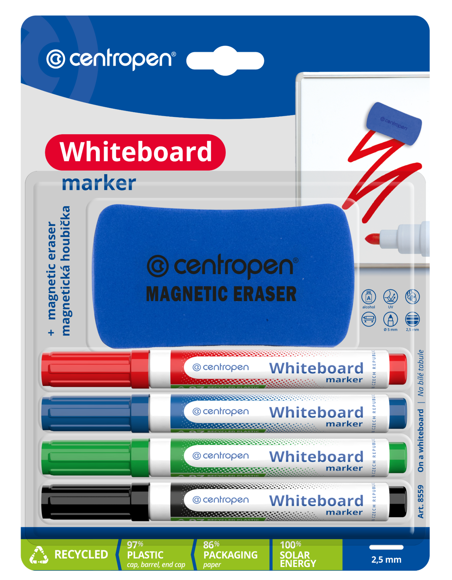 Sada značkovačů na bílou tabuli - 4 ks + magnetická houbička - 8559/4