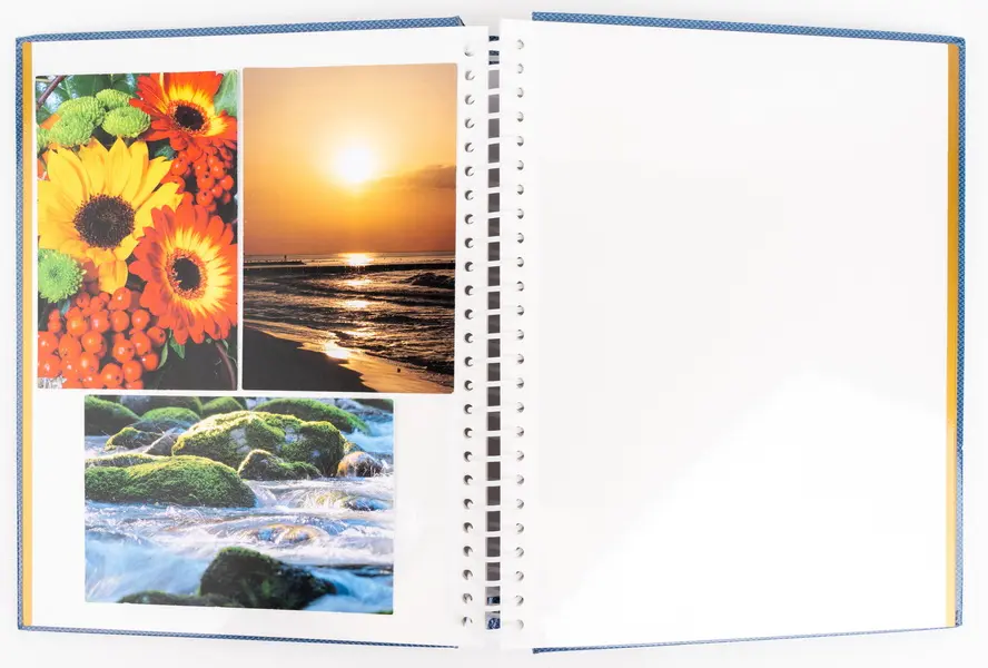 Jedná se o samolepicí fotoalbum s laminovanou obálkou v modré barvě. Album má spirálovou vazbu, která umožňuje jeho jednoduché otáčení a rozevření do roviny. Je určeno pro 40 stran (20 listů) a je ideální pro různé formáty fotografií (maximální velikost fotografie 22,5 x 28 cm), které se lepí na b