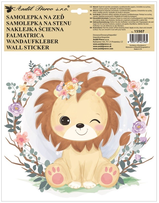 Barevná samolepka na zeď s motivem lva je dekorativní doplněk, který snadno promění interiér dětského pokoje, herny nebo jiných prostor. Motiv lva dodává prostoru výrazný a živý vzhled, který děti ocení. Samolepka je navržena tak, aby byla výrazná a esteticky působivá bez potřeby malování či jiných komplikovaných úprav. Samolepky jsou vhodné pro aplikaci na hladké a suché povrchy jako jsou stěny, dveře, zrcadla, sklo nebo nábytek.
