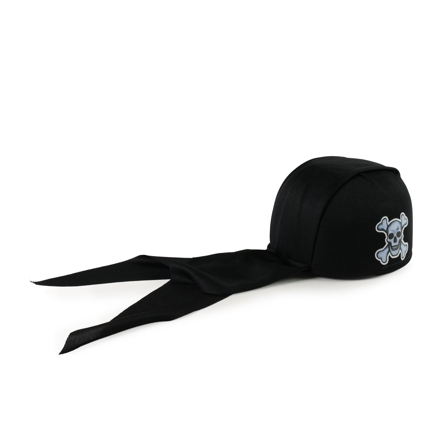 Šátek pro skutečné piráty! Tento parádní kousek je zdoben bílým potiskem s motivem lebky. Staň se hvězdou karnevalového večírku díky tomuto klobouku a ohrom tak všechny své kamarády!