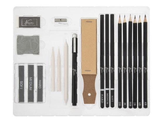 - Vše v jednom: Komplexní kolekce grafitových tužek, uhlů a doplňků pro všechny techniky kresby a stínování.