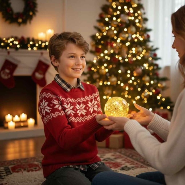Ručně foukaná skleněná svítící koule s LED osvětlením.