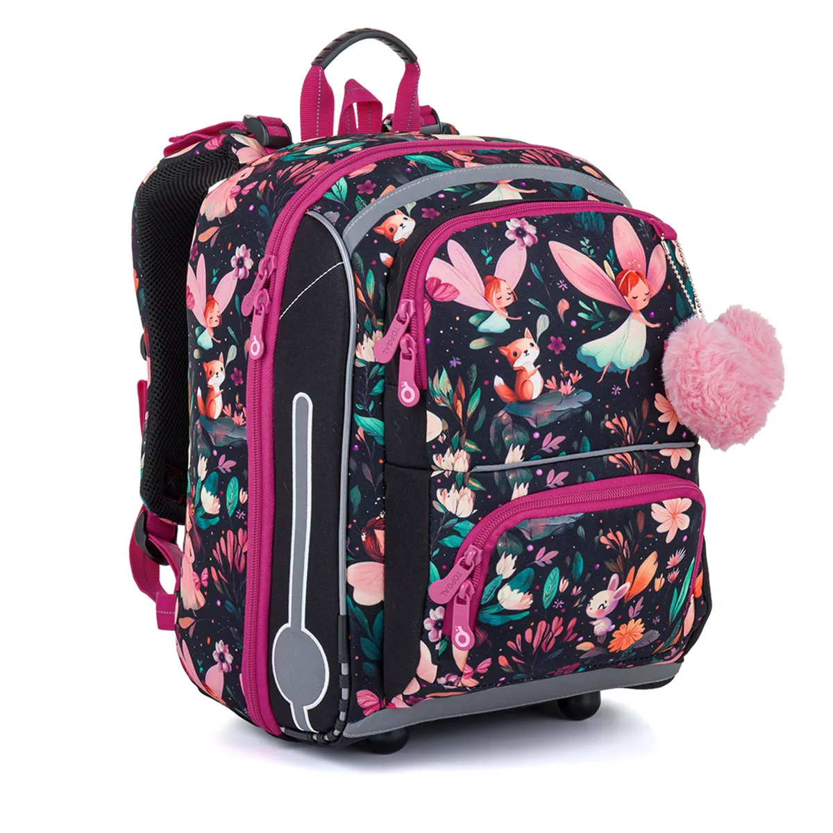 Školní aktovka Čarovný les je navržená s ohledem na potřeby malých školaček – je lehká, přehledná a krásně sedí na zádech. Romantický motiv víl, květin a lesních zvířátek v kombinaci s růžovými detaily z něj dělá batoh, kterou si děti zamilují na první pohled.