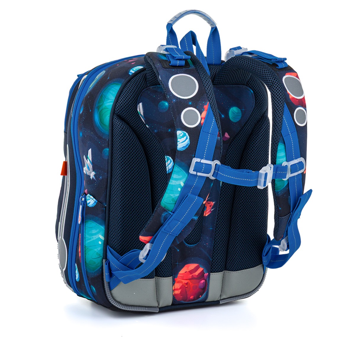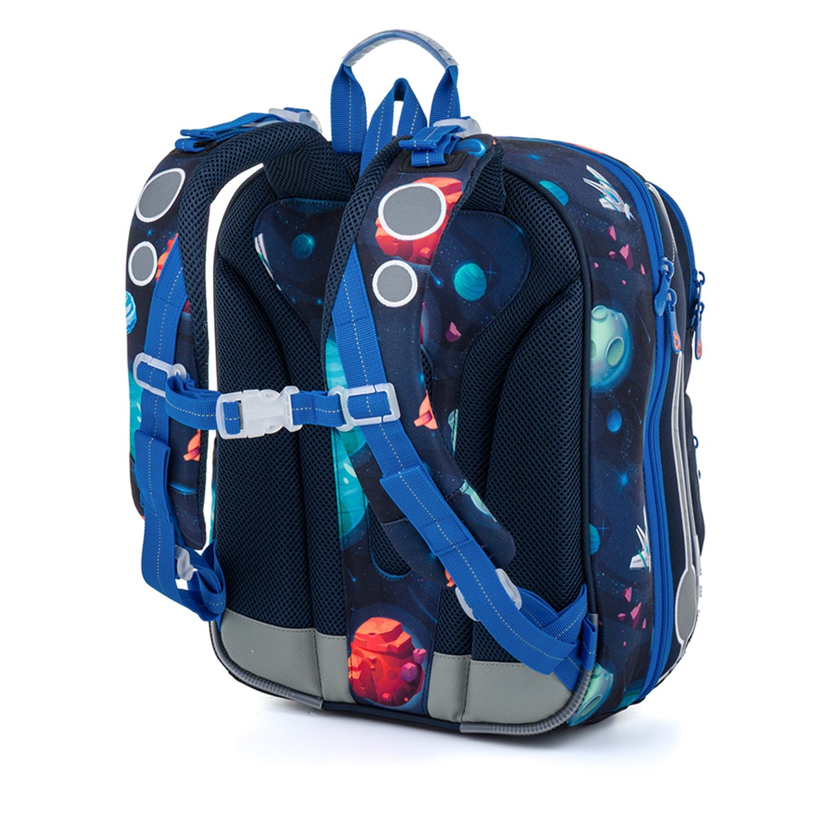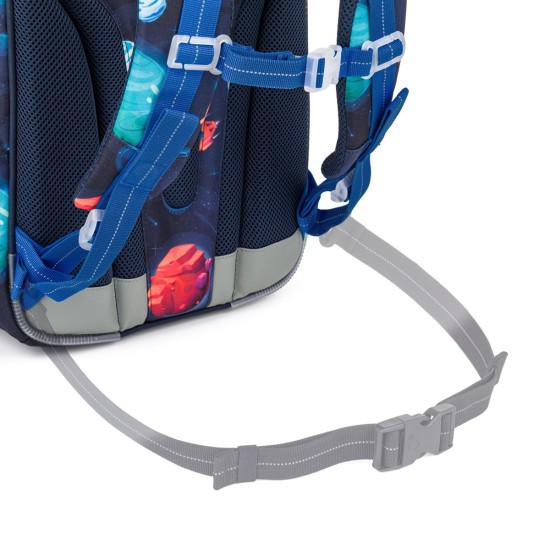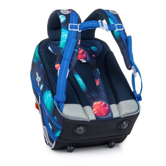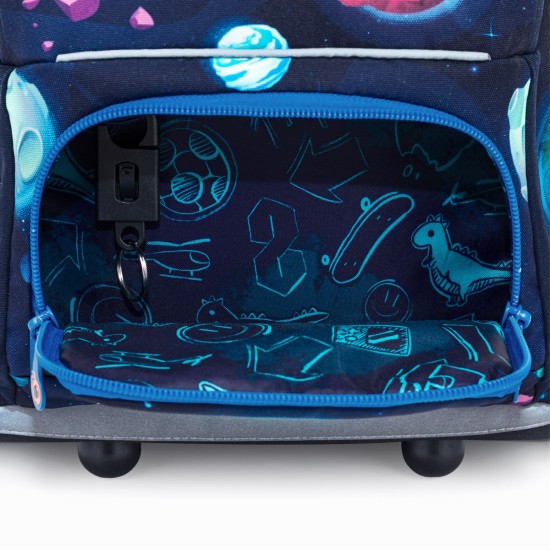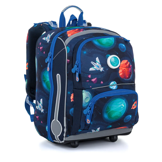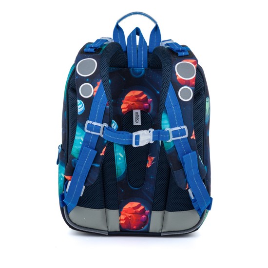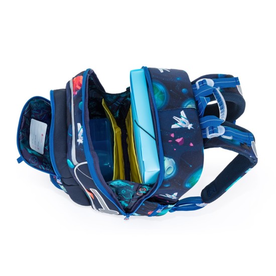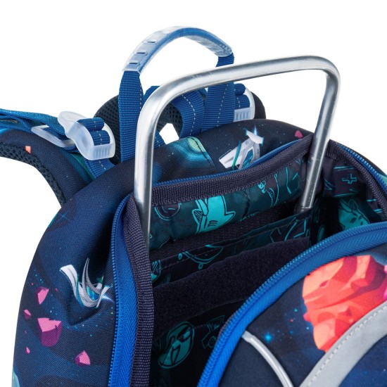 Školní aktovka je navržená s ohledem na potřeby malých školáků – je lehká, přehledná a skvěle sedí na zádech. Hravý vesmírný motiv plný planet, raket a galaxií nadchne všechny malé objevitele, kteří se chtějí vydat na svou první školní misi.