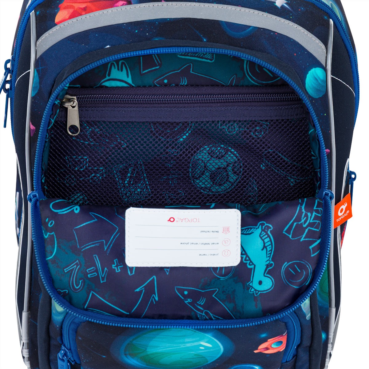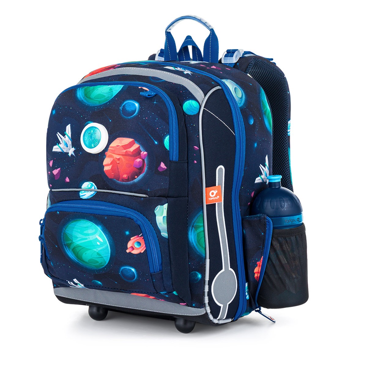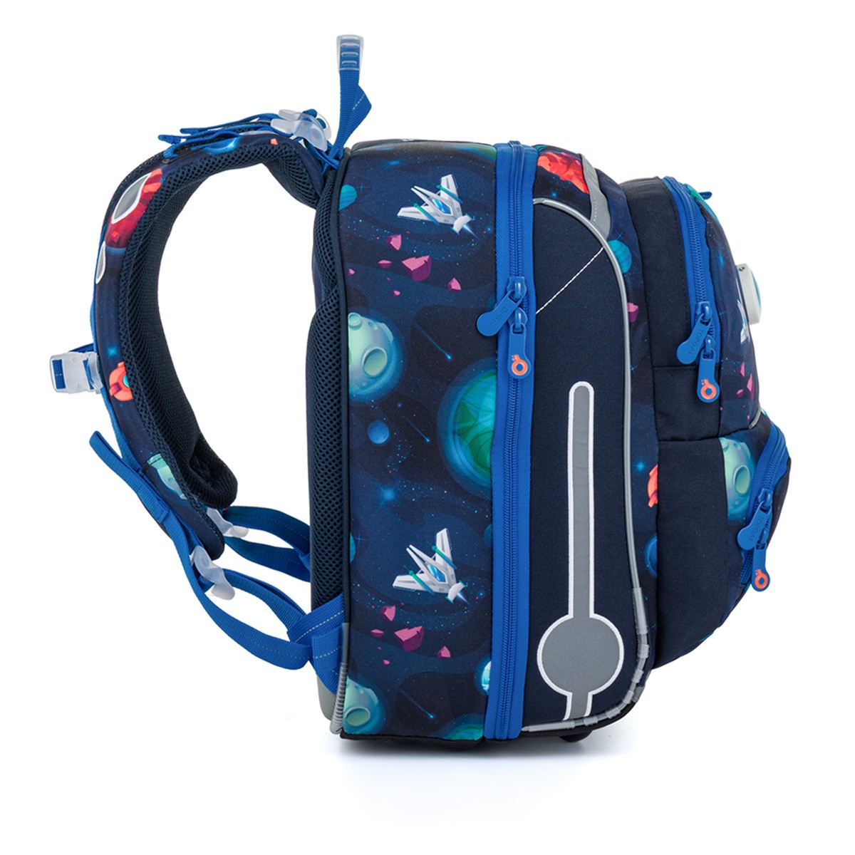 Školní aktovka je navržená s ohledem na potřeby malých školáků – je lehká, přehledná a skvěle sedí na zádech. Hravý vesmírný motiv plný planet, raket a galaxií nadchne všechny malé objevitele, kteří se chtějí vydat na svou první školní misi.