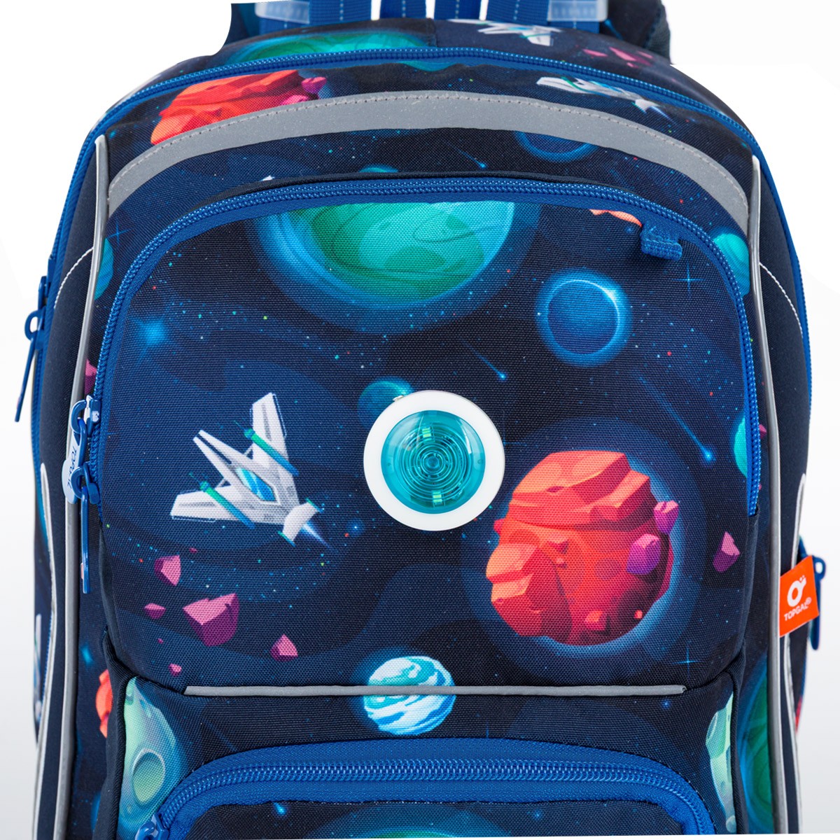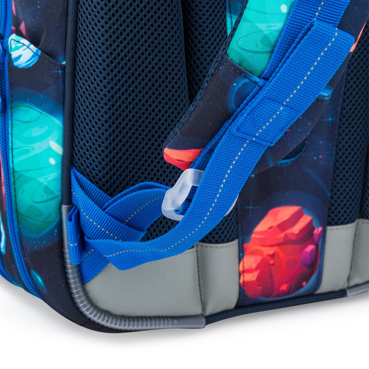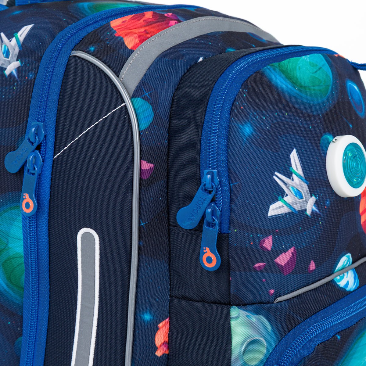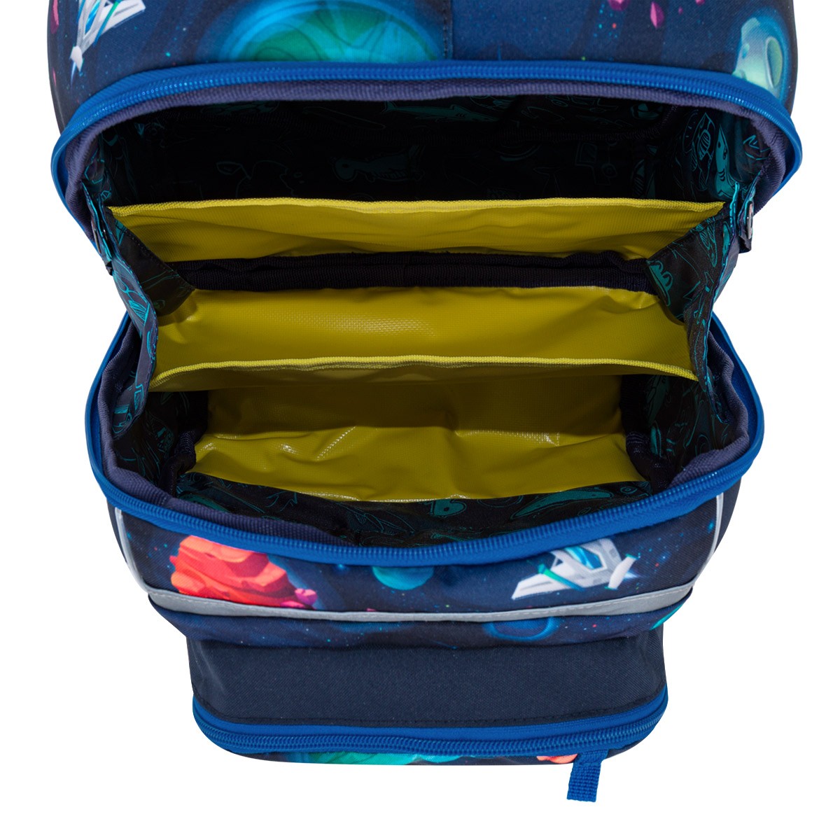 Školní aktovka je navržená s ohledem na potřeby malých školáků – je lehká, přehledná a skvěle sedí na zádech. Hravý vesmírný motiv plný planet, raket a galaxií nadchne všechny malé objevitele, kteří se chtějí vydat na svou první školní misi.