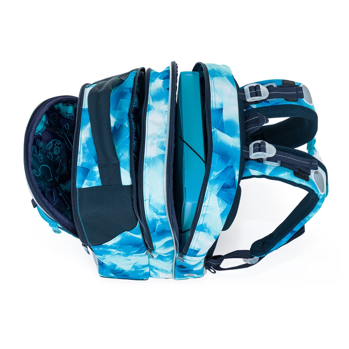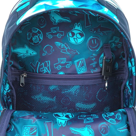 Vnitřní prostor je prakticky rozdělený pro snadnou organizaci školních pomůcek. Do zadní komory doporučujeme uložit těžší učebnice nebo desky na sešity, přední kapsa je ideální na lehčí výbavu, například penál nebo box na svačinu. Samozřejmostí je odnímatelná karabina na klíče.
