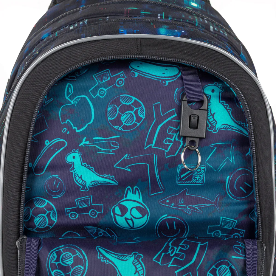 Vnitřní prostor je přehledně členěný. Do zadní části batohu doporučujeme uložit těžší učebnice nebo desky na sešity. Přední kapsa je ideální na lehčí školní výbavu, například penál nebo box na svačinu. Samozřejmostí je také odnímatelná karabina na klíče, díky které budou drobnosti vždy snadno po ruce.