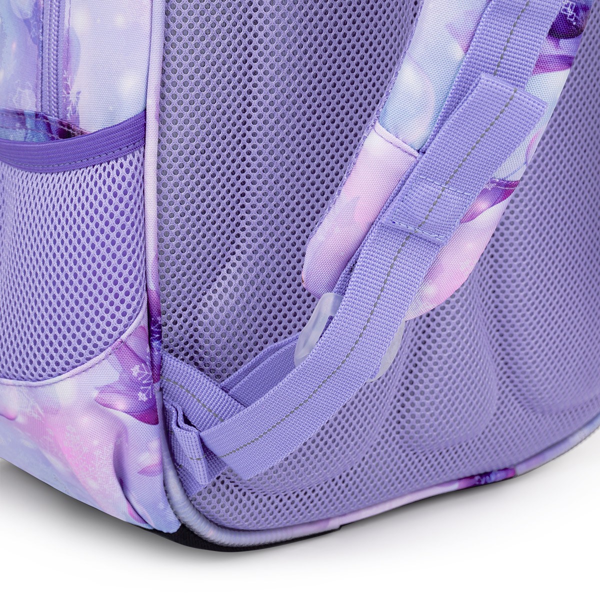 Lehký batoh inspirovaný Ledovým královstvím je vhodný pro dívky s výškou od 115 cm. Třpytivý model zdobí přívěšek v podobě tyrkysové chlupaté kuličky.