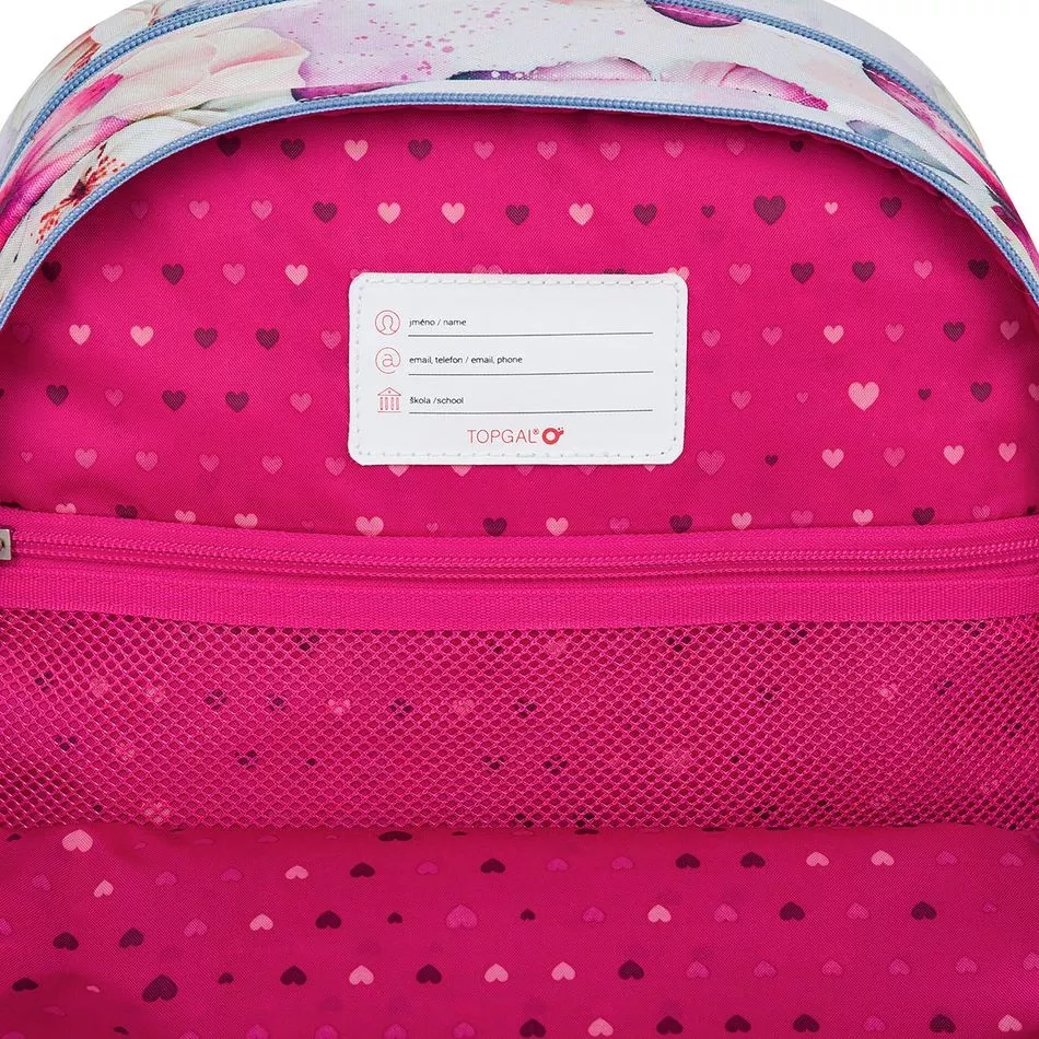 Batoh má dvě objemné hlavní komory. Do nejširší zadní komory dejte nejtěžší učebnice nebo desky na sešity. Přední komora je o něco užší, je v ní ukrytá malá síťová kapsa na zip a jmenovka.