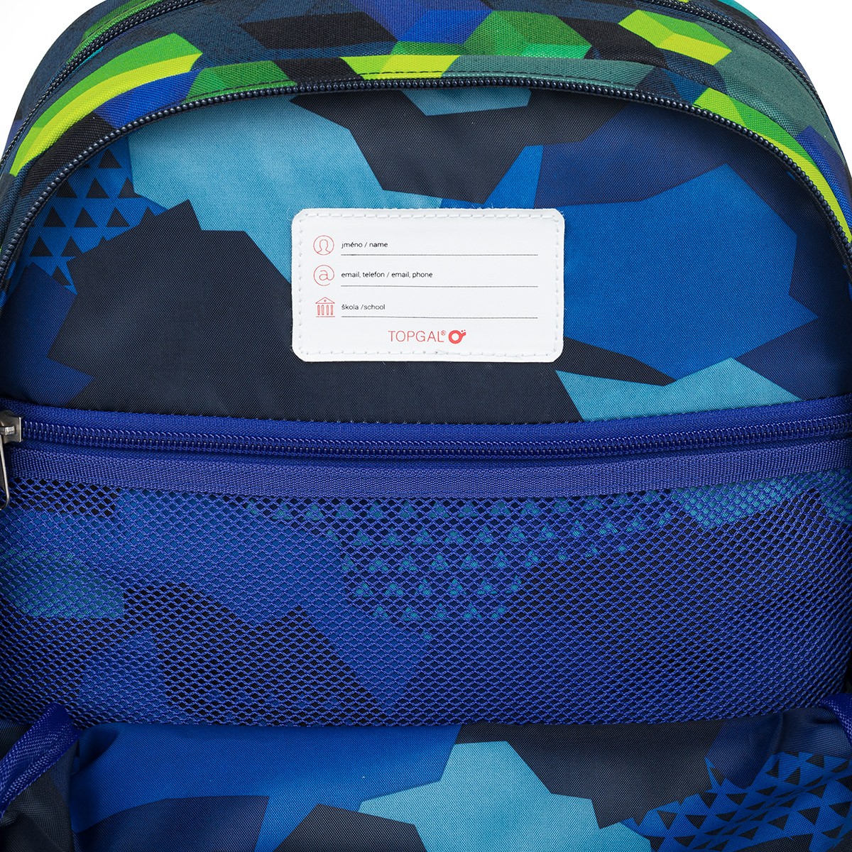 Přední komora je o něco užší, a je v ní umístěna malá síťová kapsa na zip a jmenovka.