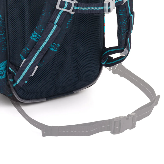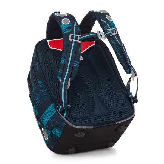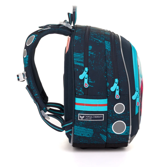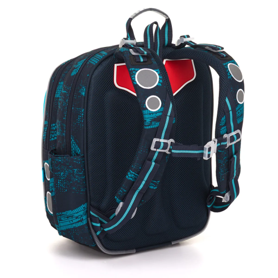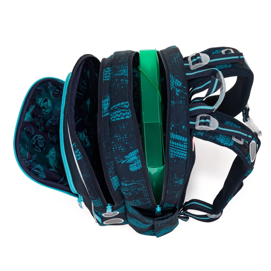 Do prostorné zadní komory doporučujeme ukládat nejtěžší učebnice nebo desky na sešity, směrem k přední části pak lehčí věci. Přední komora je užší, obsahuje praktickou síťovou kapsu na zip a jmenovku. Ideálně se hodí na penál ve stejném designu nebo box na svačinu. Do boční kapsy pohodlně vložíte lahev s objemem 0,5 litru.