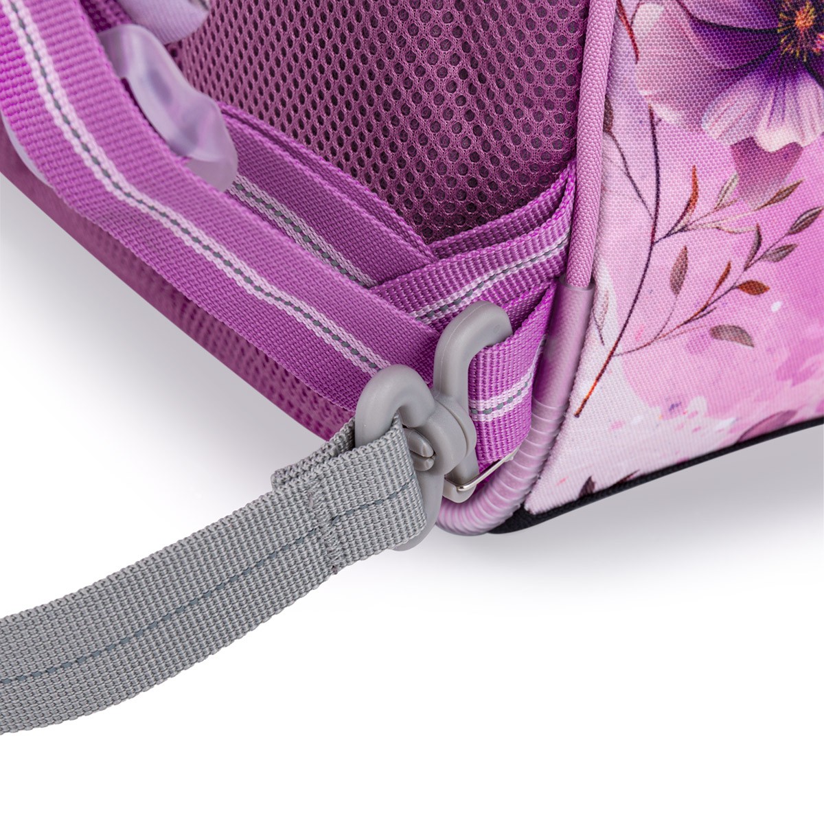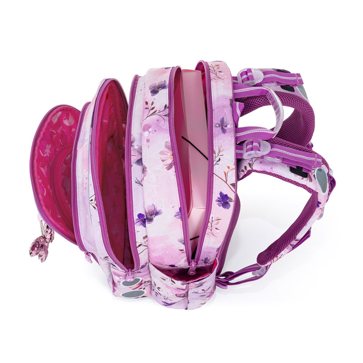 Lehoučký dvoukomorový batoh ENDY je ideální pro drobné školačky od 1. do 3. třídy. Jemný květinový motiv s vyměnitelnými obrázky a třpytivým detailem potěší všechny malé parádnice.