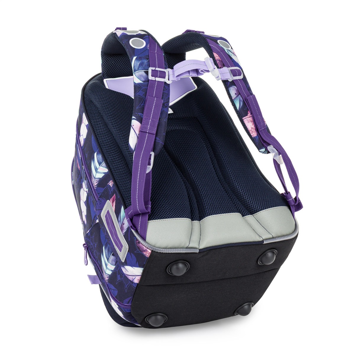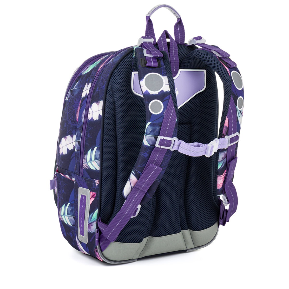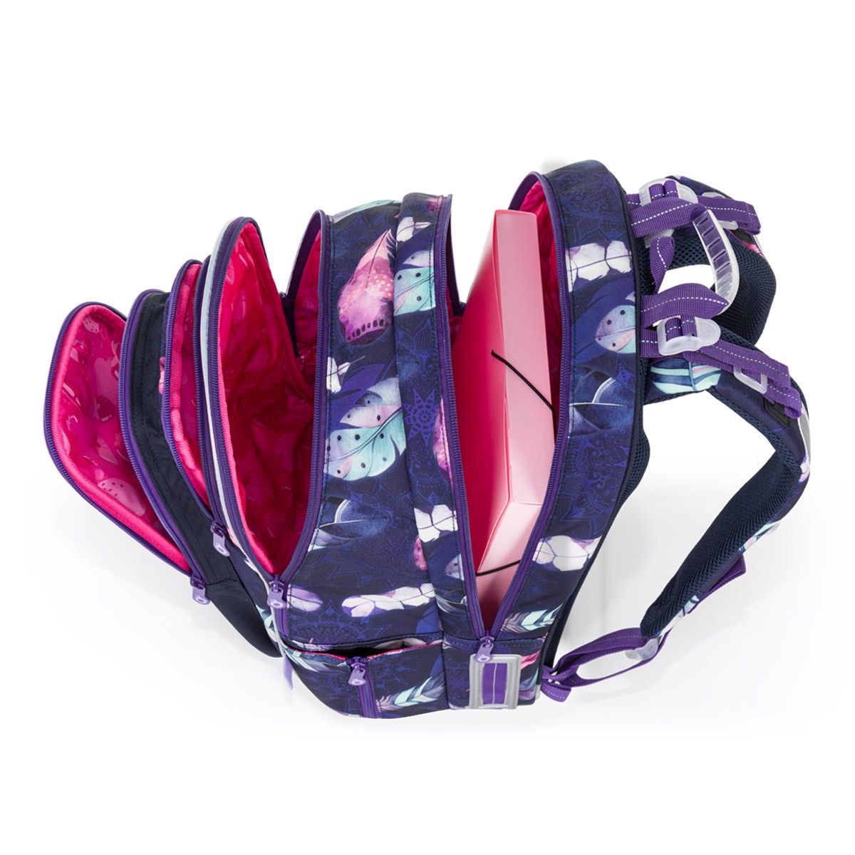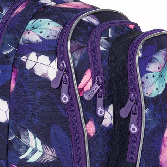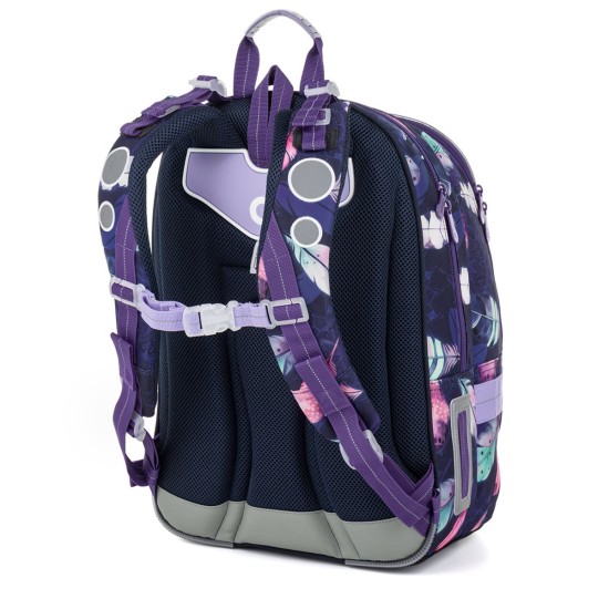 Školní batoh LYNN je lehký a prostorný parťák pro školačky od 1. do 4. třídy. Tmavě fialový motiv s barevnými pírky v boho stylu zaujme na první pohled a zároveň nabídne pohodlí i praktické členění na každý den.