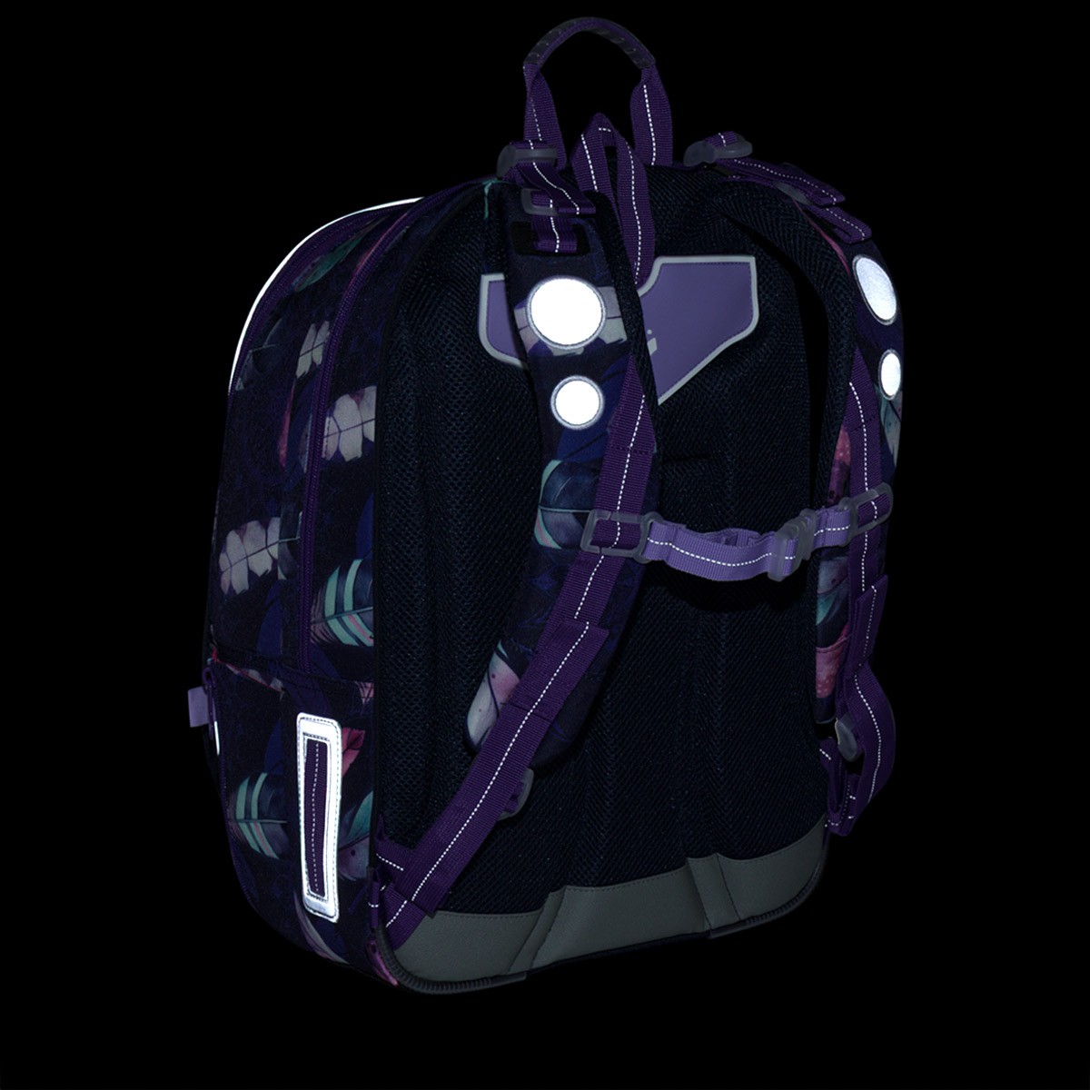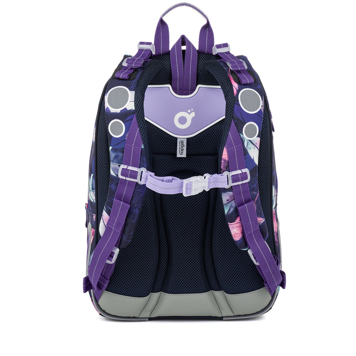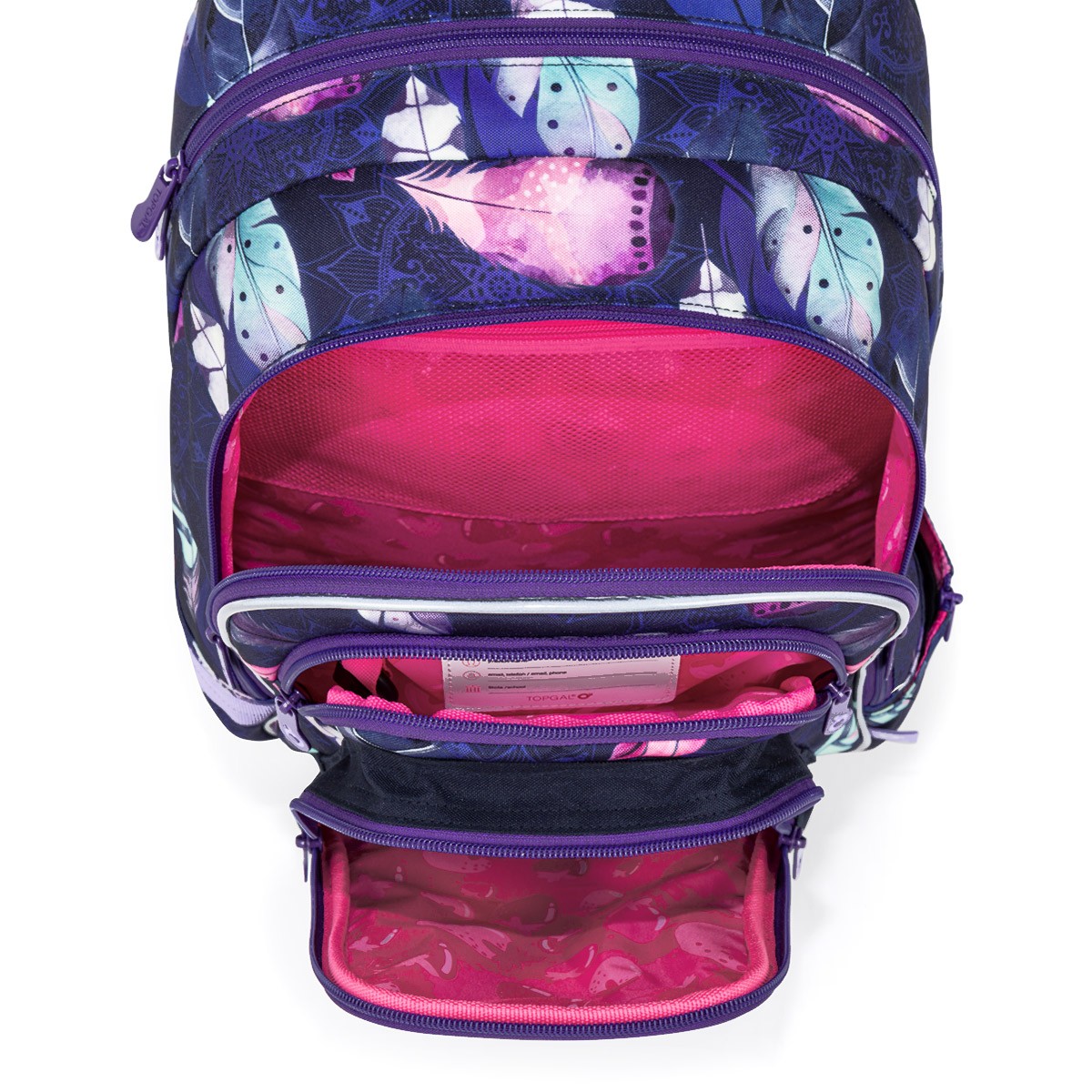 Školní batoh LYNN je lehký a prostorný parťák pro školačky od 1. do 4. třídy. Tmavě fialový motiv s barevnými pírky v boho stylu zaujme na první pohled a zároveň nabídne pohodlí i praktické členění na každý den.