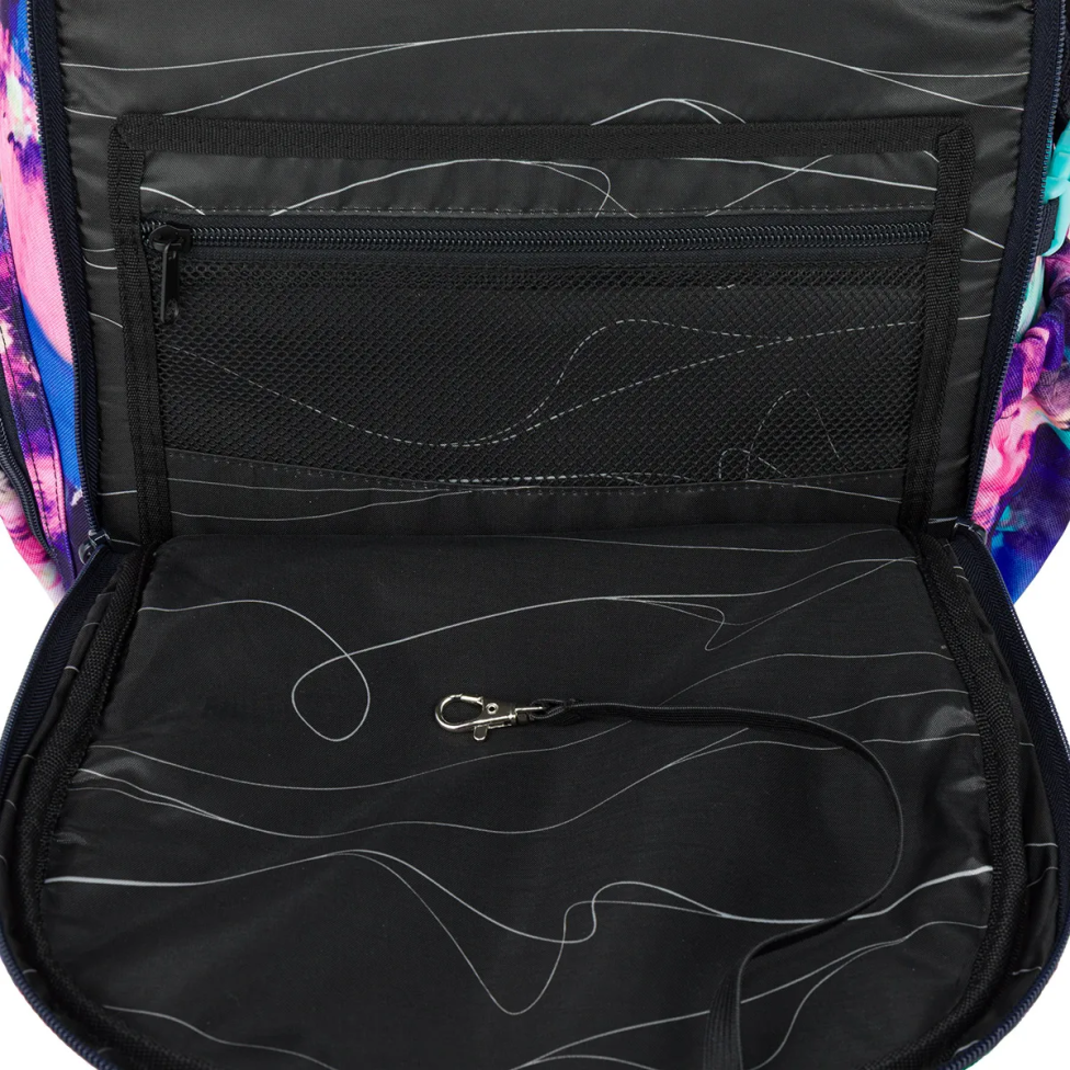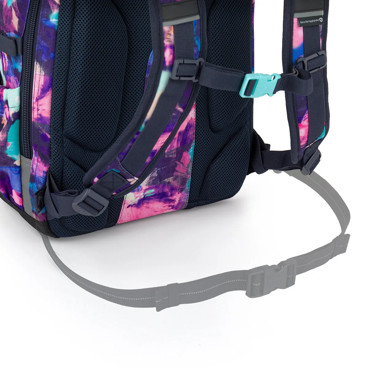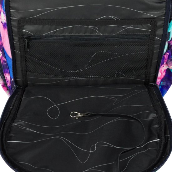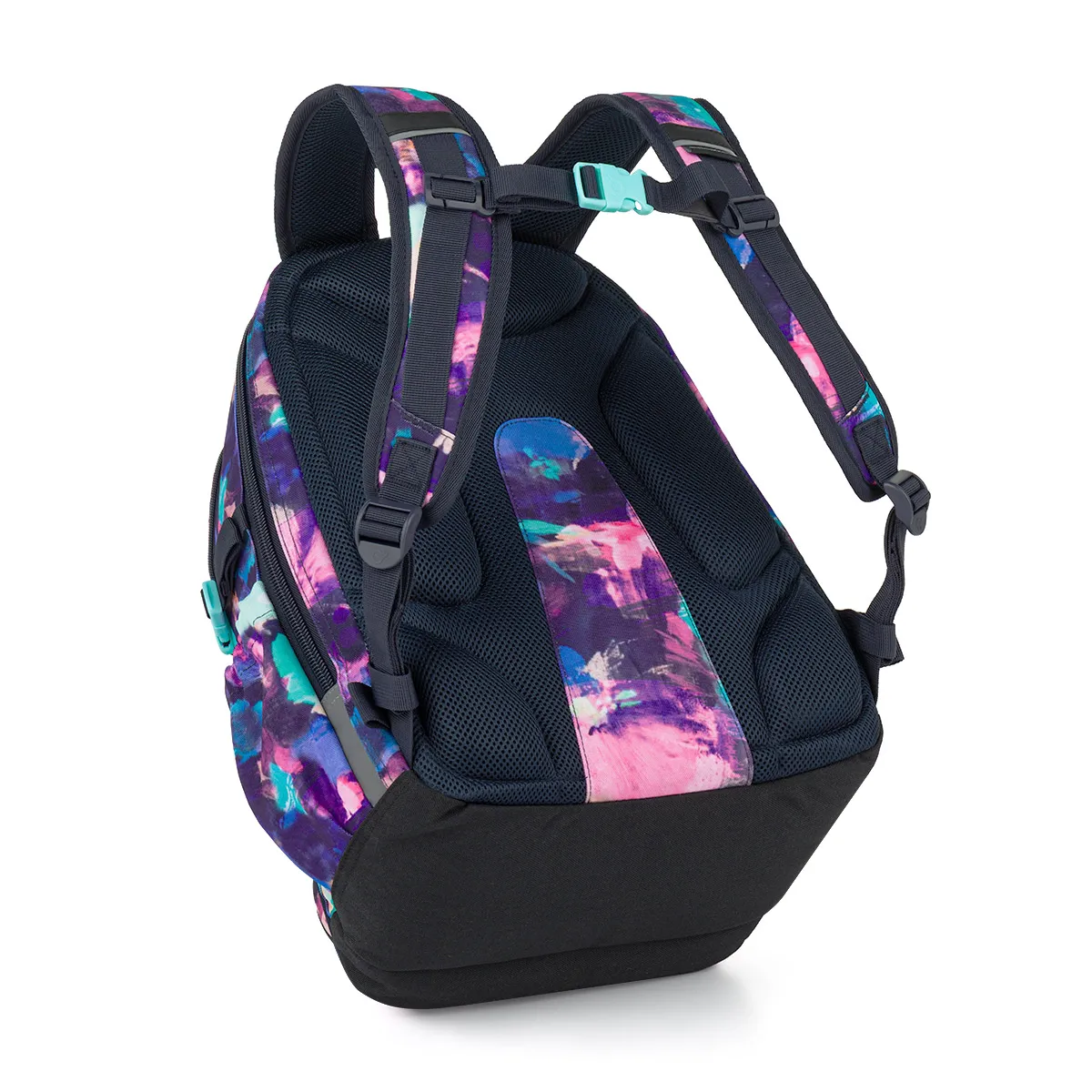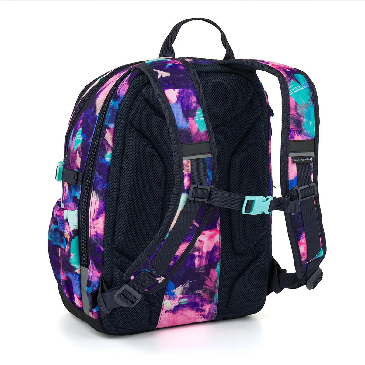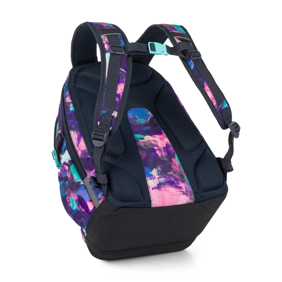 Dvoukomorový batoh s moderním abstraktním motivem v sytých odstínech růžové, fialové a tyrkysové. Záda batohu jsou polstrovaná a anatomicky tvarovaná z měkké pěny. Uvnitř zadní komory je umístěna polstrovaná kapsa na notebook i tablet.