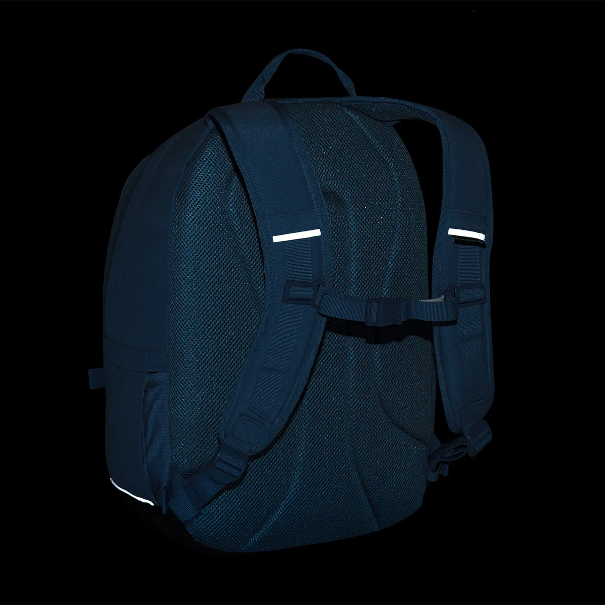 Kromě dvou hlavních komor má batoh dvě přední kapsy, do kterých se krásně vejde etue ve stejném designu nebo svačinový box. Do přední kapsy jsme umístili praktickou síťovanou kapsičku na doklady a poutko na klíče. Po obou stranách batohu najdete hluboké kapsy na lahev s pitím. Reflexní prvky jsou decentně zakomponovány tak, aby nenarušovaly čistý vzhled batohu, ale zajistily vaši bezpečnost.