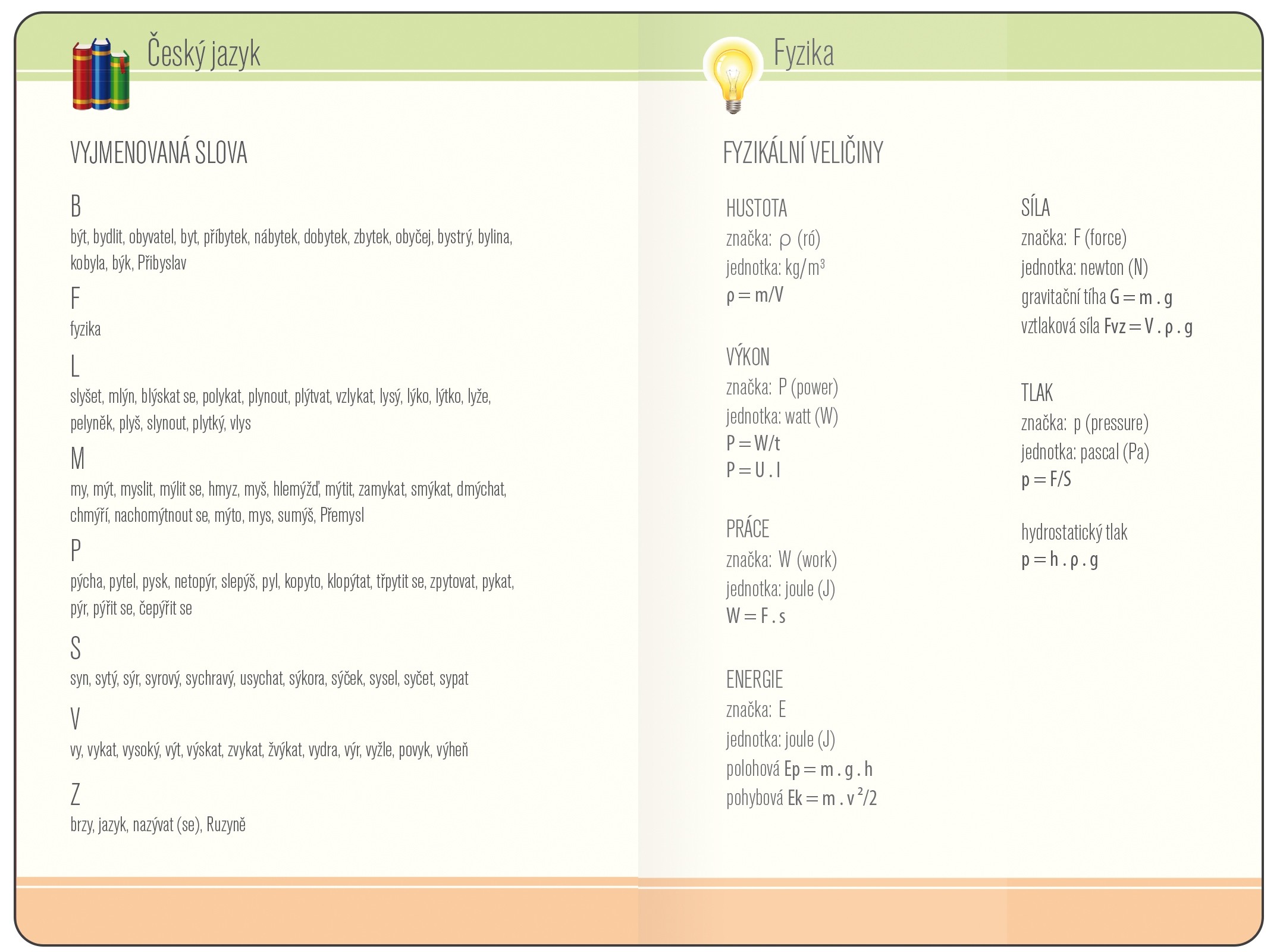 Obsahuje české kalendárium, rozvrh hodin, adresář, přehled školních prázdnin a užitečné informace z předmětů jako matematika, chemie, fyzika a český jazyk, což usnadní přípravu na