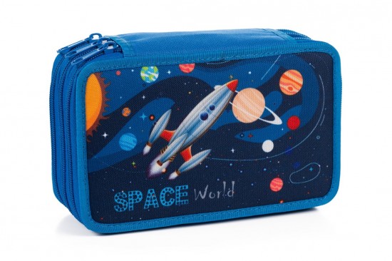 Školní penál třípatrový bez náplně s vesmírným motivem.