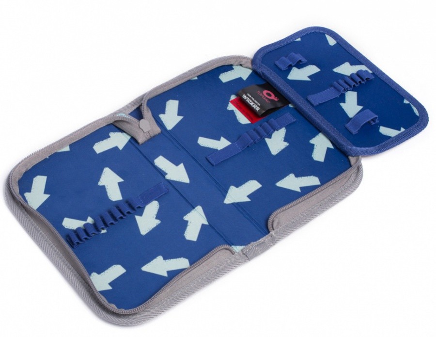 Jednopatrové školní pouzdro je vybaveno osmnácti klasickými gumovými úchyty na pastelky a fixy, čtyřmi širšími úchyty na pravítka, kružítko či nůžky a dvěma většími úchyty na gumu a ořezávátko.