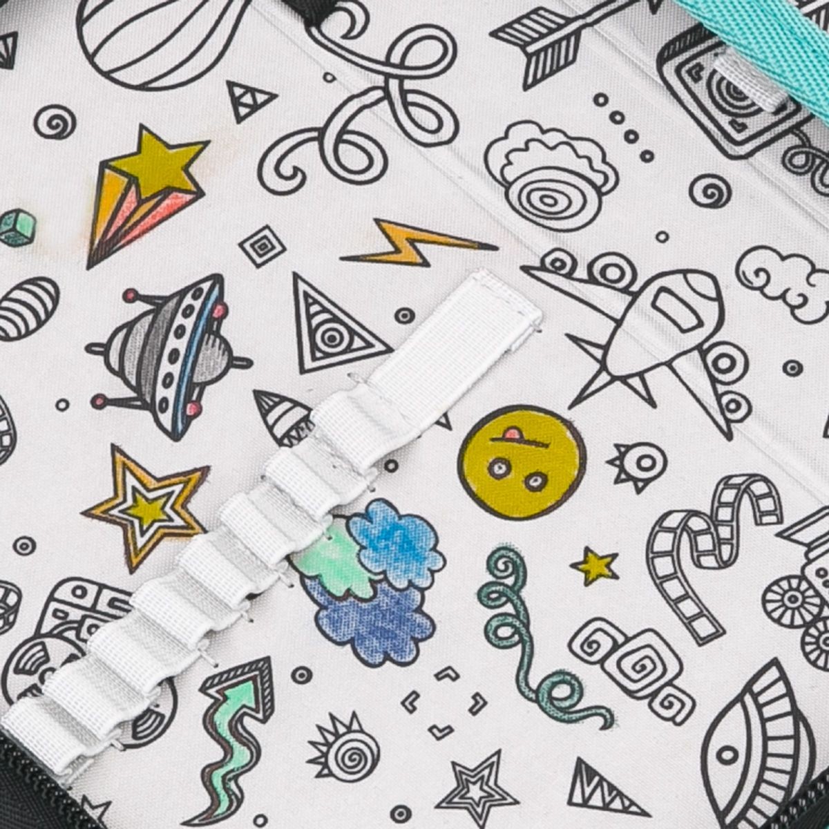 Vnitřní podšívka školních penálů je vyrobena z šedé látky a obrazce na ní vytištěné je možné vybarvovat.