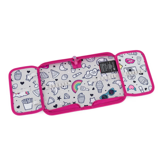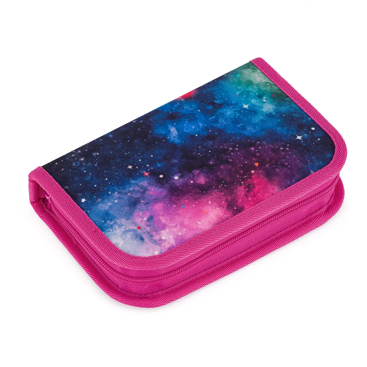 Jednopatrové školní pouzdro se dvěma klopami. Díky gumovým úchytům se do nich vejde celkem 21 pastelek, tužek a fixek. Tři širší úchyty poslouží na pravítko, kružítko či nůžky. Dva větší na gumu a ořezávátko.