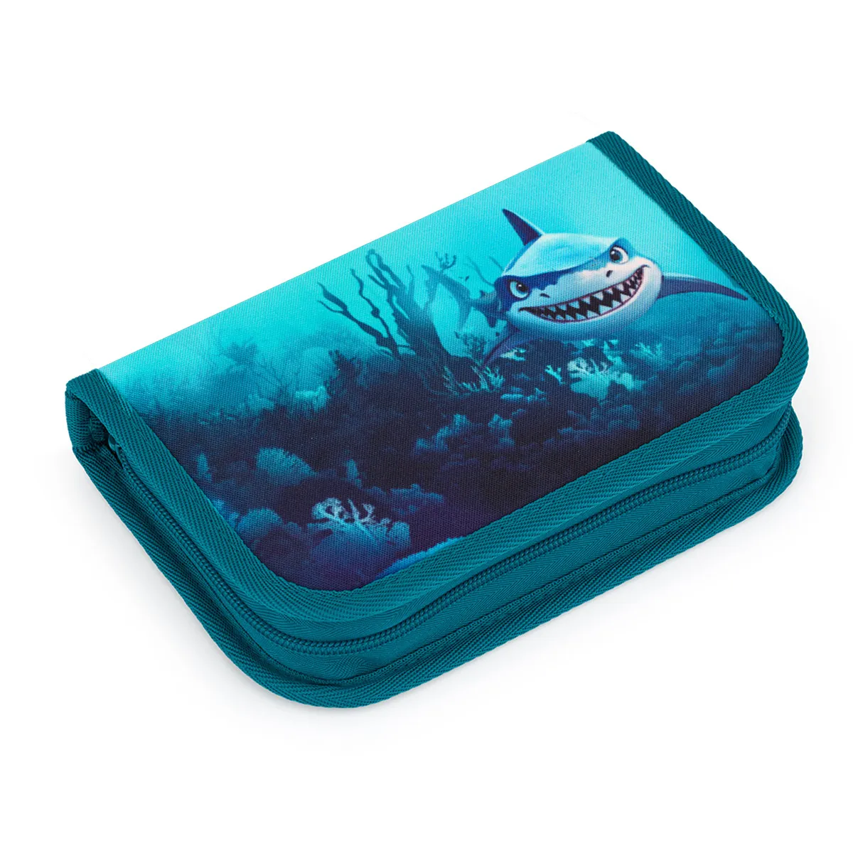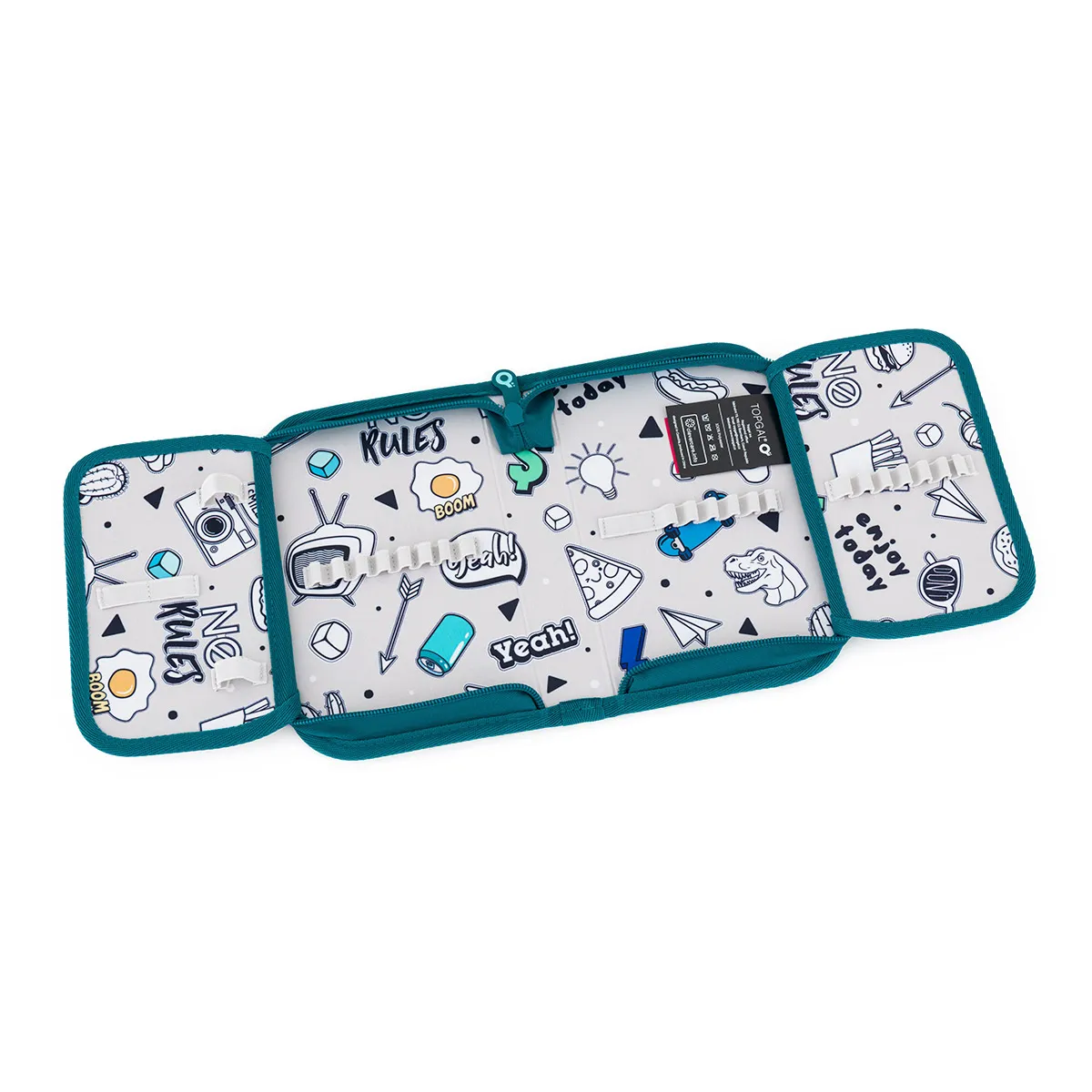 Jednopatrové školní pouzdro se dvěma klopami. Díky gumovým úchytům se do nich vejde celkem 21 pastelek, tužek a fixek. Tři širší úchyty poslouží na pravítko, kružítko či nůžky. Dva větší na gumu a ořezávátko.