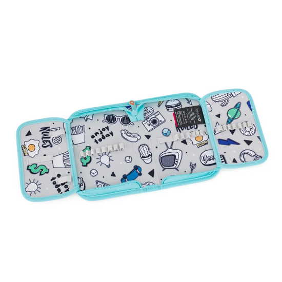 Jednopatrové školní pouzdro se dvěma klopami. Díky gumovým úchytům se do nich vejde celkem 21 pastelek, tužek a fixek. Tři širší úchyty poslouží na pravítko, kružítko či nůžky. Dva větší na gumu a ořezávátko.