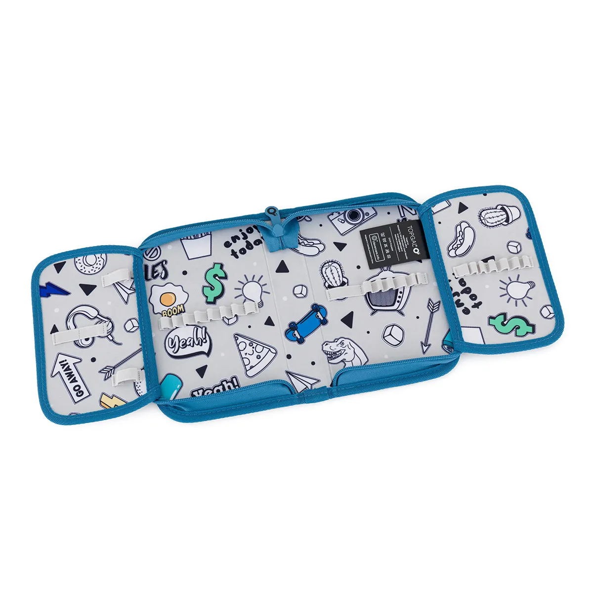 Jednopatrové školní pouzdro se dvěma klopami. Díky gumovým úchytům se do nich vejde celkem 21 pastelek, tužek a fixek. Tři širší úchyty poslouží na pravítko, kružítko či nůžky. Dva větší na gumu a ořezávátko.