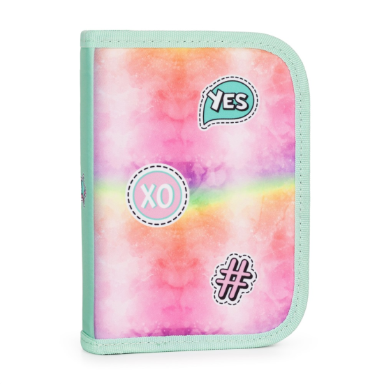 Penál: Jednopatrový se dvěma chlopněmi, poutka na psací potřeby a průhledná fólie na rozvrh hodin.