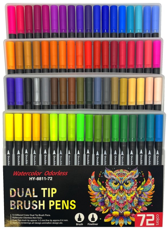 Kulaté oboustranné fixy se štětcovým a tenkým hrotem na druhé straně.