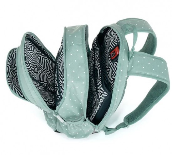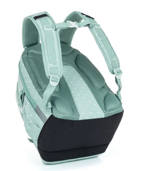 Mintový studentský batoh s rošťáckými puntíky a stylovou nášivkou.