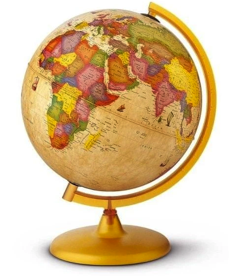 Světelný glóbus, soudobá politická mapa antického vzhledu, s vyznačením plaveb dávných mořeplavců. Podstavec a půlpoledník z plastu v „medové“ barvě. Dárková odnosná krabice. Popisky – český jazyk. Vyrobeno v EU.