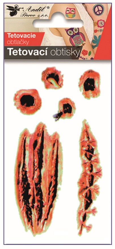Vneste do své zábavy originální tetovací obtisky s motivy realisticky vypadajících jizev a jizviček. Tyto dočasné tetování dodají vašemu vzhledu hravý i netradiční efekt – vhodné pro Halloween, strašidelné párty, karnevaly, tematické večírky ne