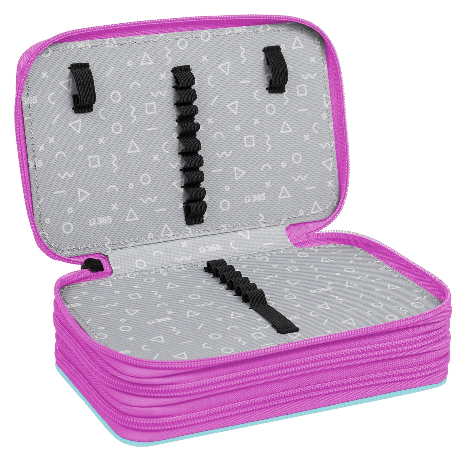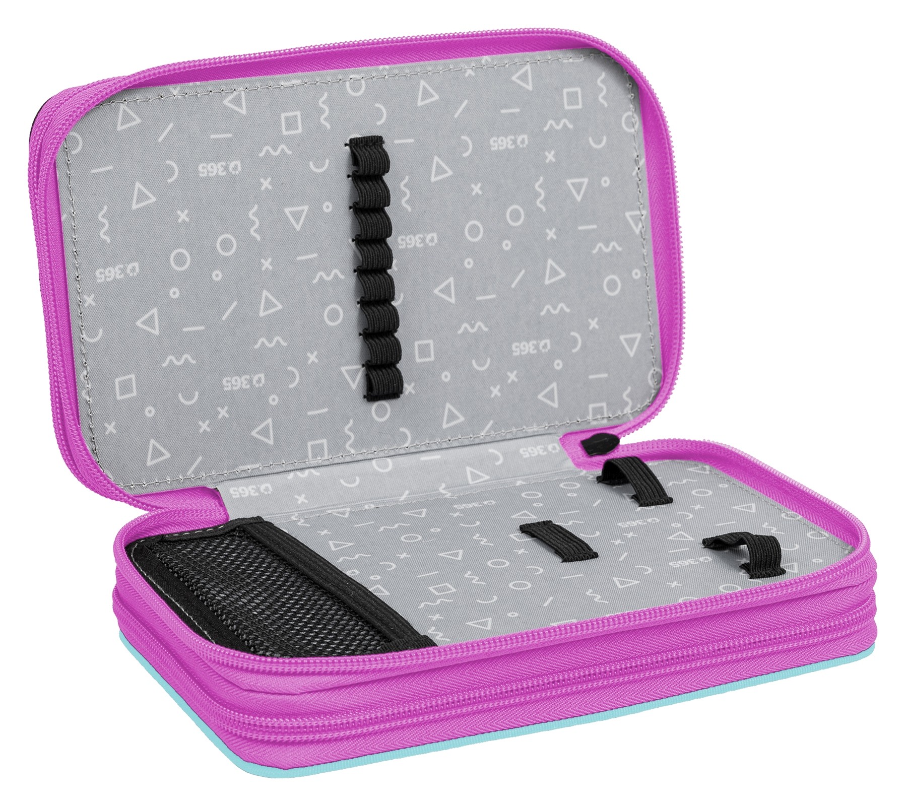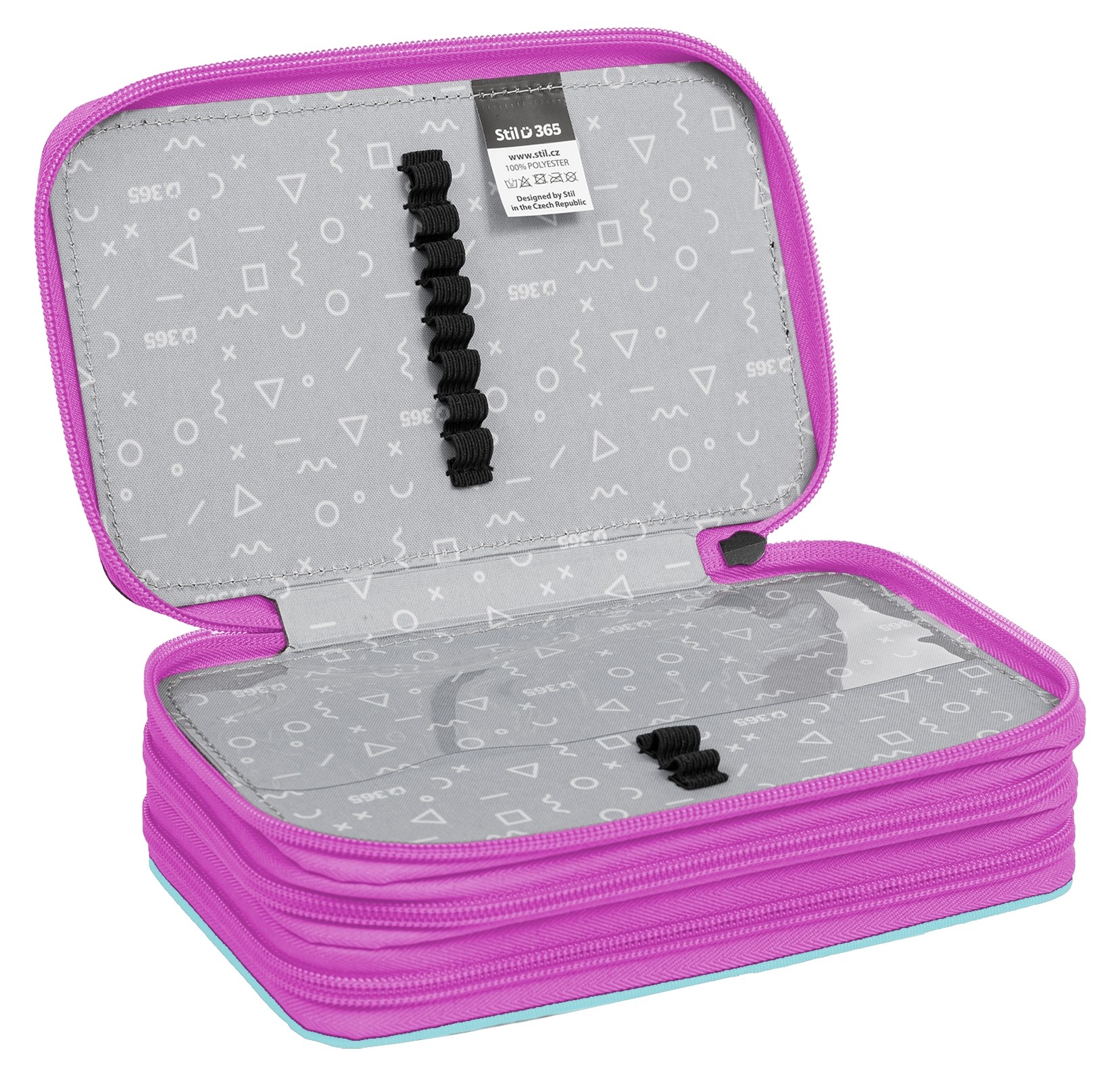 První patro obsahuje 8 gumiček na pastelky, 3 širší gumičky na ořezávátko i gumu a nově také síťovanou kapsičku s pružným lemem na uložení drobností.