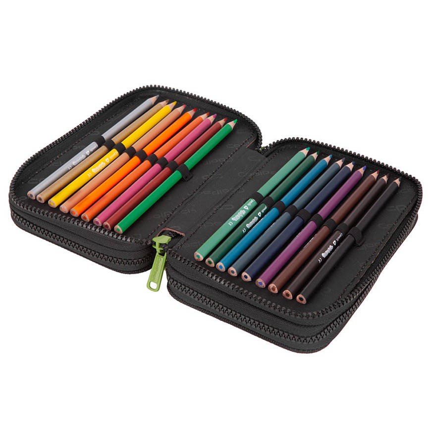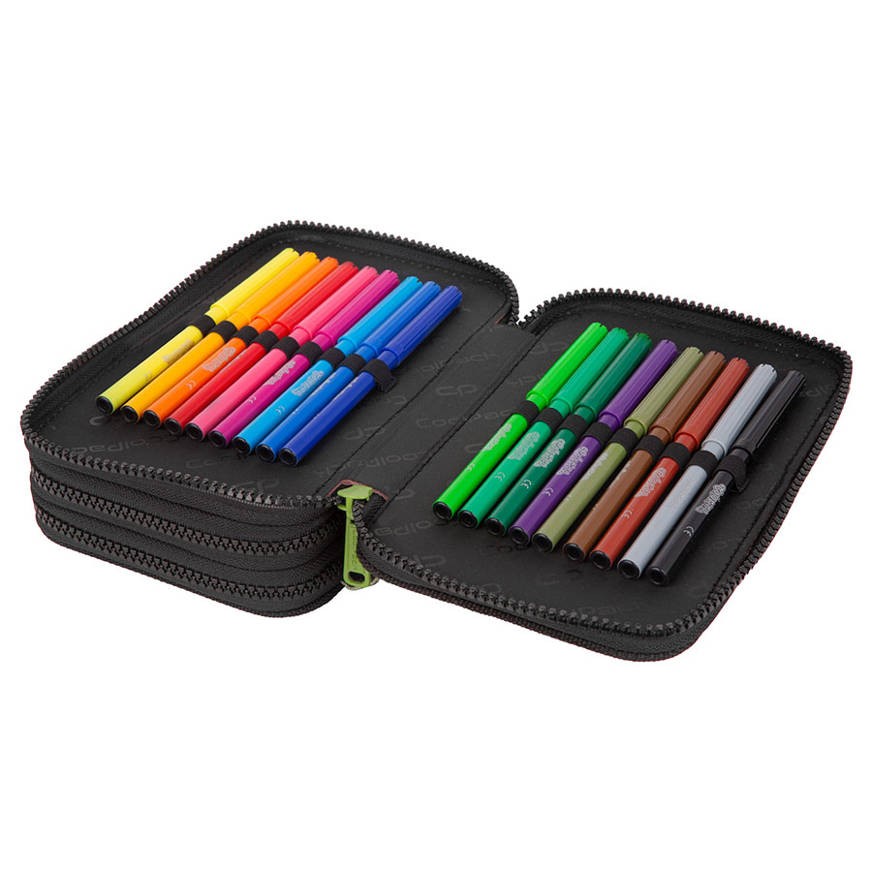 Obsahuje 18 fixek, 18 pastelek, 3 pera, tužku, pravítko, ořezávátko a gumu, úhloměr, trojúhelník, nůžky