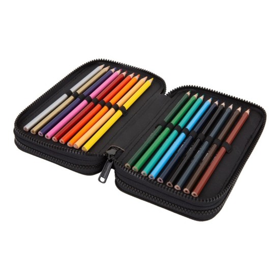 Obsahuje 18 fixek, 18 pastelek, 3 pera, tužku, pravítko, ořezávátko a gumu, úhloměr, trojúhelník, nůžky