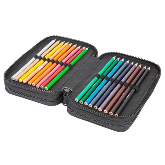 Obsahuje 18 fixek, 18 pastelek, 3 pera, tužku, pravítko, ořezávátko a gumu, úhloměr, trojúhelník, nůžky
