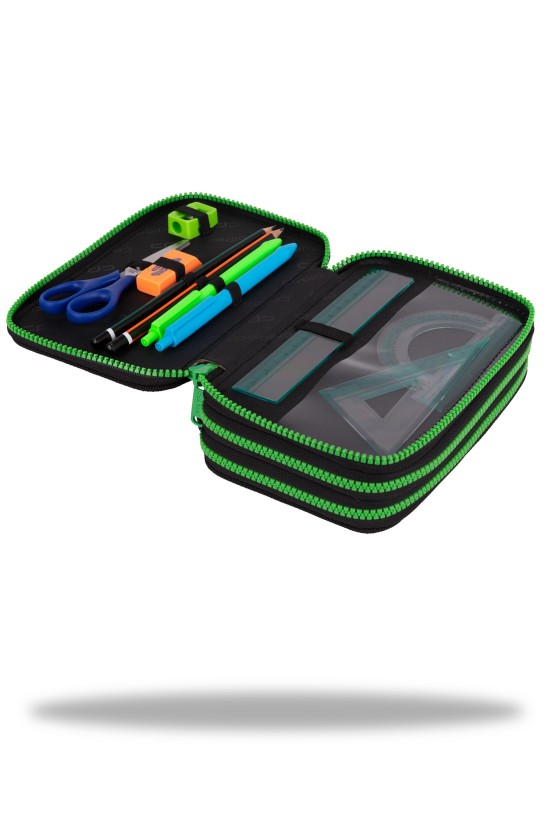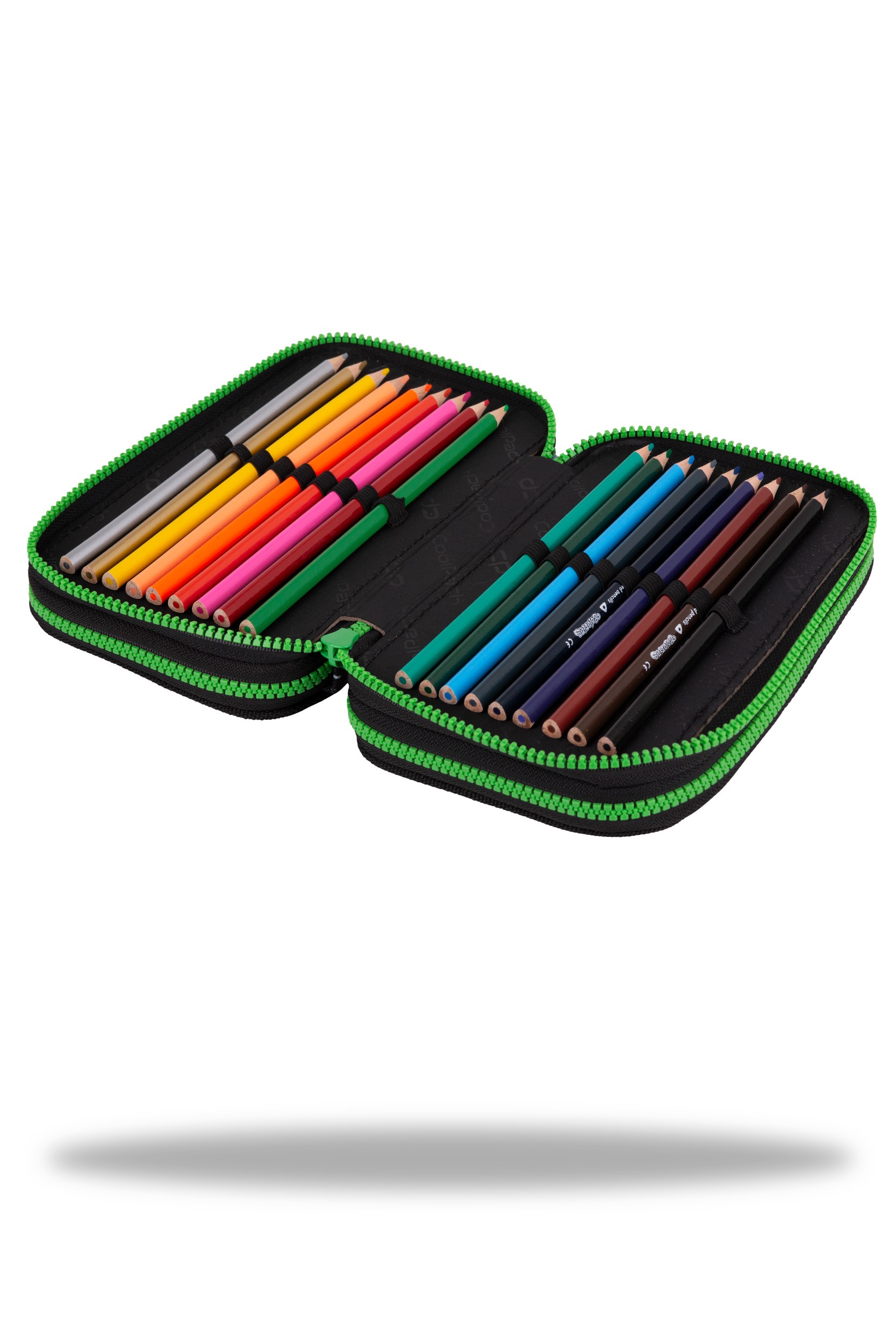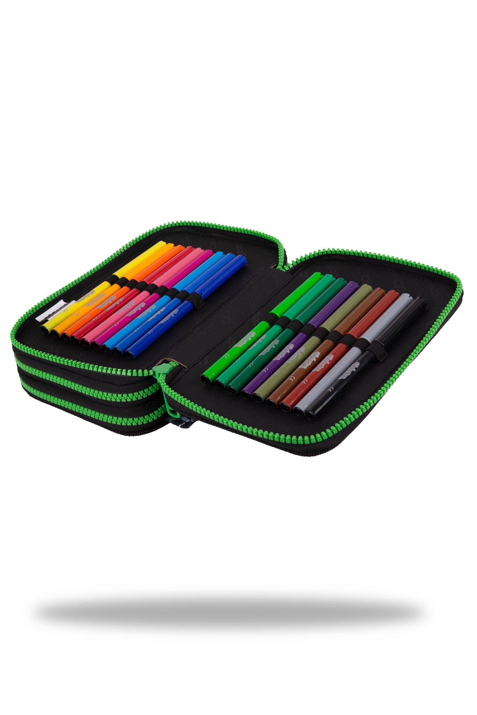 Obsahuje 18 fixek, 18 pastelek, 3 pera, tužku, pravítko, ořezávátko a gumu, úhloměr, trojúhelník, nůžky